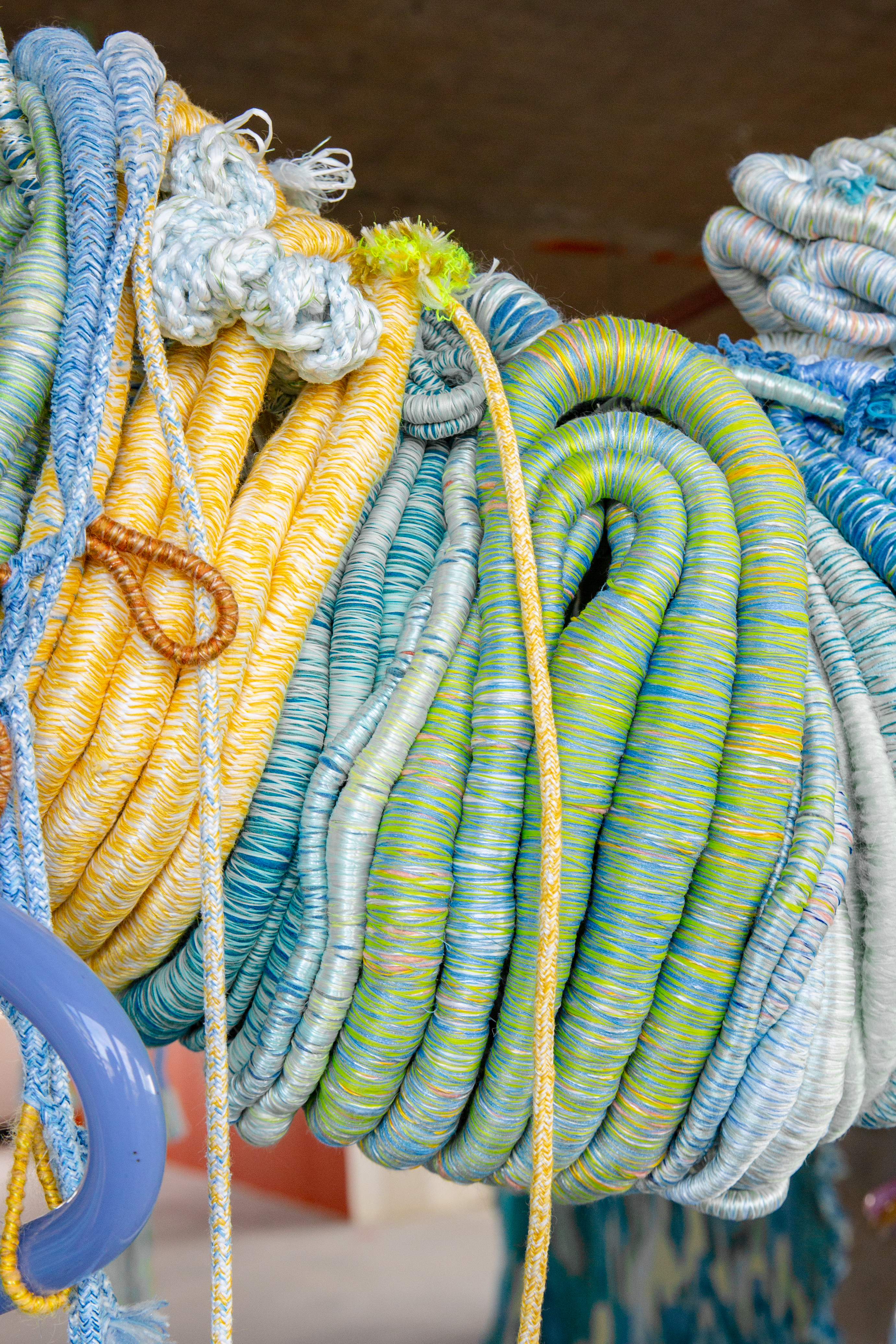 Waarom zou je nieuwe garens laten maken,a ls er nog zoveel restjes op de plank liggen? Kunstenaar Sandra Keja Planken heeft die vraag leidend gemaakt in het ontwerpproces van Nature's Visual Sound, een installatie over het verval van het leven in zee. Hierin groiet restgaren uit de voorraad van het TextielLab en Wolkat uit tot een sprookjesachtige onderwaterwereld. Keja Planken laat de bij elkaar gesprokkelde deadstock van katoen, mohair, gerecyclede petgarens en wol woekeren als weer tot leven gekomen koralen, zeewieren en -grassen. Dit jaar werkte ze op de passement- en tuftafdeling van het lab aan de uitbreiding van haar rif, waarin ze een heleboel 'losse eindjes' verwerkte door ermee te tuften, gimpen, knopen en vlechten - met her en der nog een oud T-shirt van zichzelf ertussen. Daarnaast werden er ook nog geblazen glasresten van het Glasmuseum Lab Leerdam in het textiele netwerk geïntegreerd.