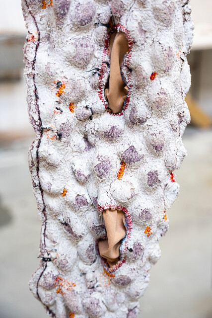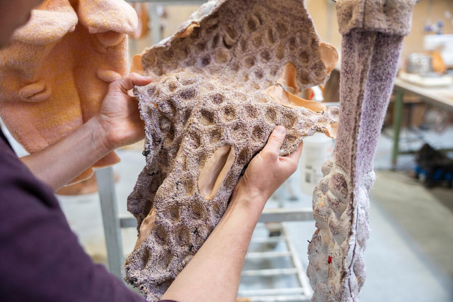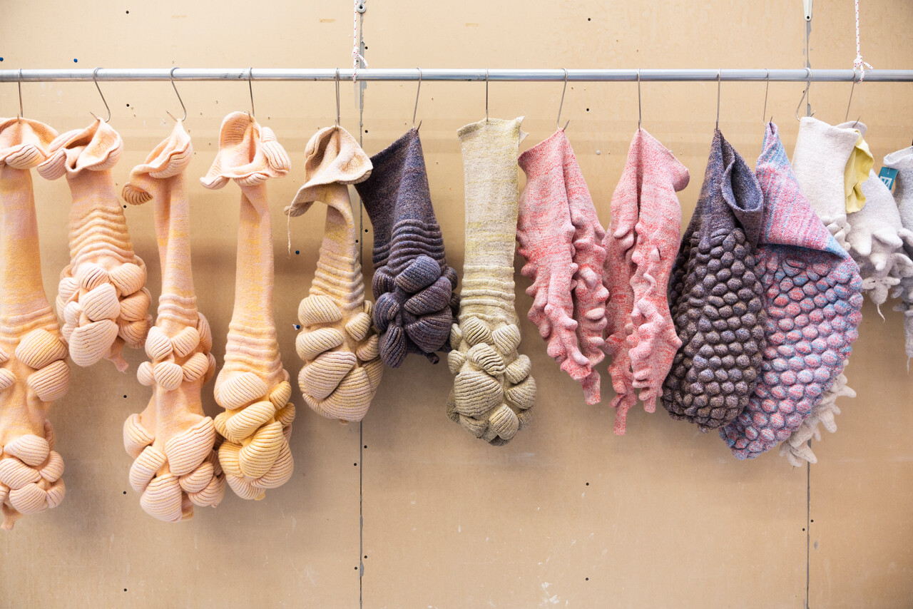 Chudyk vervaardigde de breisels op de computergestuurde vlakbreimachine en viltte ze vervolgens door te wassen. Zo ontstond een sterke, dichte textielstructuur die het vloeibare kleimateriaal kan dragen zonder te lekken. Tijdens het maakproces bepaalde hij de uiteindelijke afmetingen en vormen.