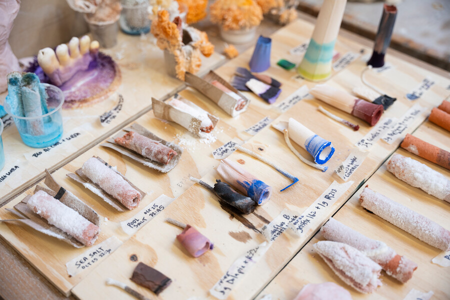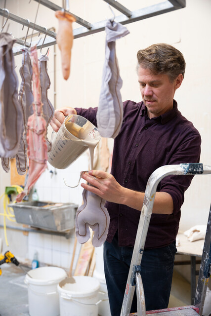 In het TextielLab onderzocht hij hoe hij gebreide en vervilte wollen mallen kon inzetten voor het gieten van keramiek. Deze mallen dragen texturen die hij baseerde op landschappen van extractie, zoals mijnbouw en industriële infrastructuren.