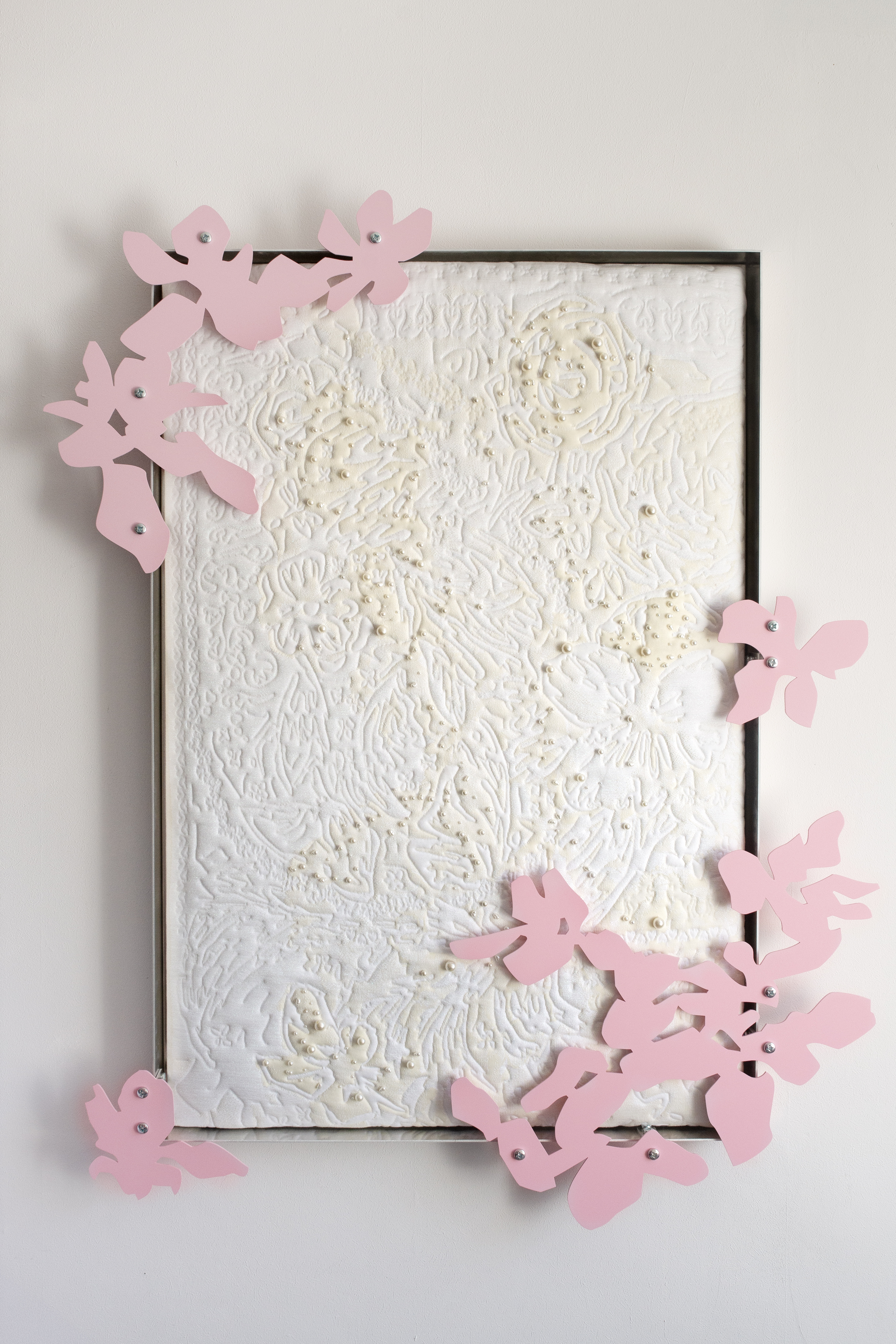 In het wandobject zijn verborgen typografische symbolen verwerkt die verwijzen naar thema’s als transformatie, vrouwelijke en queer empowerment. Deze symbolen zijn ontwikkeld vanuit archiefonderzoek in onder andere het Huis van het Boek, het TextielMuseum en het Amsterdam Museum. ‘Magnolia’ is geïnspireerd op een persoonlijke ervaring tijdens een bezoek aan het Louisiana Museum in Kopenhagen, waar een bloeiende magnoliaboom aanleiding gaf tot een reeks nieuwe typografische vormen. Deze ornamenten zijn niet alleen zichtbaar in het werk, maar ook geïntegreerd in het speciaal ontworpen frame.